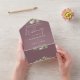 All in one wedding invitation featuring parents' names, botanical greenery rustic leaves, and elegant typography on a mauve background. The invitation includes a perforated RSVP card featuring a QR code. Designed by Thisisnotme©