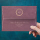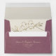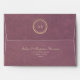 Simple, modern, minimalist, calligraphy romantic mauve purple 5x7 envelope for wedding invitation with return address, unique gold couple love birds drawing and monogram initials at the top back.