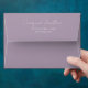 Mauve coloured mailing envelope for your wedding invitations and features your name and address printed on back flap in a modern script style. Personalise your envelope by editing and replacing name and address with your own. Edit further to change font style or colour. Select your envelope size that fits your invitation.