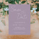 Simple, silver foil print wedding Save the Date card with white, stylised script on mauve colour background. Edit names, date and location with your own wedding information. Change foil colour if desired. Background colour may be changed as well to match your wedding colour scheme.