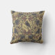 This throw pillow features crows, dragonflies, and beetles surrounded by flowers and leaves in shades of mauve and grey on a tan background.