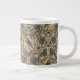 This giant mug features crows, dragonflies, and beetles surrounded by flowers and leaves in shades of mauve and grey on a tan background.