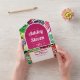 This wedding invitation combines vibrant and bold elements to create a maximalist and colourful design. The invitation showcases a beautiful pattern of tropical leaves in shades of green, vibrant orange, and magenta purple. It also features two boho arches, one in magenta for the main text and another in green for the tear-off RSVP card, adding a touch of elegance to the overall design. The outside of the invitation displays the same tropical pattern, with your names and address elegantly placed on a white arch.