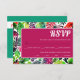 This RSVP card radiates with a vibrant and eye-catching display of tropical leaves in a mix of green, orange, purple, and magenta pink. Showcasing a maximalist style, the magenta frame pops with the text 'RSVP' in a bold font. On the reverse side, the Paolo Veronese green background is accented by the couple's initials in a bright orange placed on a white band, creating a sophisticated look.