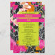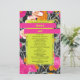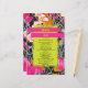 Neon yellow rectangle shape over pink orange and peach modern floral with dark marbleised design. Names are neon yellow on hot pink bars.