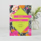Neon yellow 6 sided geometric shape over pink orange and peach modern floral with dark marbleised design. Names are neon yellow on hot pink bars.