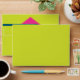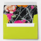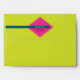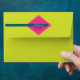 Neon yellow envelope with floral marbled modern art pattern inside. Back top flat features pink diamond shape with neon text over blue bar.