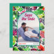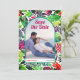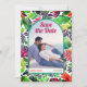 Step into a world of vibrant colours and tropical vibes with this eye-catching Save the Date announcement card. Embracing a maximalist style, the card showcases a stunning boho arch adorned with the couple's photo, creating a personal touch. Behind the arch, a lively pattern of tropical leaves adds a burst of colour and energy. The phrase 'Save the Date' is elegantly displayed in a captivating combination of magenta purple and vibrant orange, making it impossible to miss. To provide all the necessary details, the card includes the date and the names of the couple. On the back, guests will find a convenient QR code, allowing them to effortlessly scan for additional information.