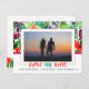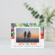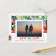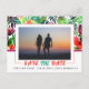 This vibrant and lively Save the Date announcement postcard showcases a maximalist design with a burst of colourful tropical leaves and a stylish rectangular frame. On the top two-thirds of the postcard behind the photo there is a captivating pattern of tropical leaves, adding a touch of exotic beauty. Below the couple's photo, the phrase 'Save the Date' is boldly displayed in a vibrant green and orange typography, creating a striking contrast against the lush background. The date and the names of the couple are elegantly included, completing this eye-catching and memorable invitation.