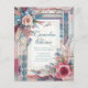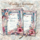 Maximalist wedding themed item with text template fields and graphics featuring an eclectic mix of decoupage, fabrics, ribbons in pastel shades of blue, pink, teal. Scrapbook decoupage style item with a shabby, country, vintage floral vibe.