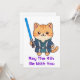 Adorable ginger tabby cat dressed as a Jedi holding a blue lightsaber with May the 4th Be With You text.