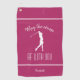 This cute and modern golf towel features the quote “May the Course Be With You!” with a lady golfer silhouette in white on a chic pink background with double white accent borders. A customisable template allows you to add a name, initials, or short line of text.