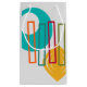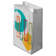 This gift bag has a mid-century modern design with a turquoise circle with a hole in it, four rectangles, orange, teal, beet, and green, and a gold pointy circle. If you like the design but prefer different colours, message me.