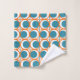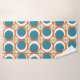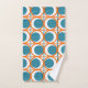 This towel set has a mid-century modern design of open orange circles with solid teal circles running across the pattern with teal vertical lines and orange horizontal lines.