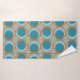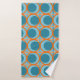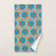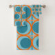This towel set has a mid-century modern design of open orange circles with solid teal circles running across the pattern with teal vertical lines and orange horizontal lines on a field of teal.