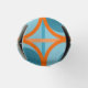 This bottle cooler has a mid-century modern design of open orange circles with solid teal circles running across the pattern with teal vertical lines and orange horizontal lines on a field of teal.
