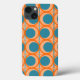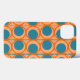This phone case has a mid-century modern design of open orange circles with solid teal circles running across the pattern with teal vertical lines and orange horizontal lines.