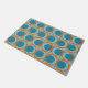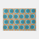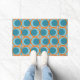 This doormat has a mid-century modern design of open orange circles with solid teal circles running across the pattern with teal vertical lines and orange horizontal lines on a field of teal.