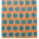 This shower curtain has a mid-century modern design of open orange circles with solid teal circles running across the pattern with teal vertical lines and orange horizontal lines.