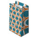This gift bag has a mid-century modern design of open orange circles with solid teal circles running across the pattern with teal vertical lines and orange horizontal lines.
