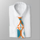 This tie has a mid-century modern design of open orange circles with solid teal circles running across the pattern with teal vertical lines and orange horizontal lines.