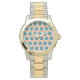This watch has a mid-century modern design of open orange circles with solid teal circles running across the pattern with teal vertical lines and orange horizontal lines.