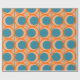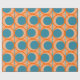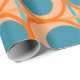 This wrapping paper has a mid-century modern design of open orange circles with solid teal circles running across the pattern with teal vertical lines and orange horizontal lines.