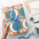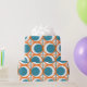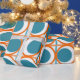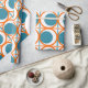 This wrapping paper has a mid-century modern design of open orange circles with solid teal circles running across the pattern with teal vertical lines and orange horizontal lines.