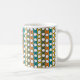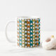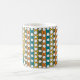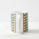 This mug has a mid-century modern design of white “deformed” circles connected with black lines on a field of green, orange, turquoise, and gold strips. If you like the design but prefer different colours, message me.