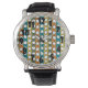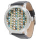 This men's watch has a mid-century modern design of white “deformed” circles connected with black lines on a field of green, orange, turquoise, and gold strips. If you like the design but prefer different colours, message me.