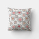 This throw pillow has a mid-century modern design of flowers made of circles in shades of pink, cranberry and beige and black lines.