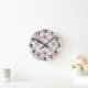 This wall clock has a mid-century modern design of flowers made of circles in shades of pink, cranberry and beige and black lines.
