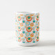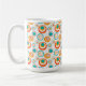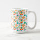 This mug has a mid-century modern design of concentric circles in gold, orange, and turquoise on a white background.