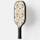 This pickleball paddle has a mid-century modern design of concentric circles in gold, orange, and turquoise on a white background.