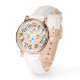 This women's watch has a mid-century modern design of concentric circles in gold, orange, and turquoise on a white background.