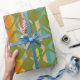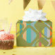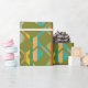 This wrapping paper has a mid-century modern design of rounded green rectangles with holes on a background of stripes in mid-century modern colours. If you like the design but prefer different colours, message me.