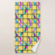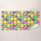 This towel set has a mid-century modern design of crescent moons divided horizontally into three colours, pink, blue, lavender, or seafoam, split in half and scattered on a grid with a yellow background. If you like the design but want different colours, message me.