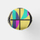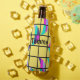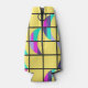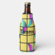 This bottle cooler has a mid-century modern design of crescent moons divided horizontally into three colours, pink, blue, lavender, or seafoam, split in half and scattered on a grid with a yellow background. If you like the design but want different colours, message me.