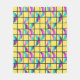 This medium fleece blanket has a mid-century modern design of crescent moons divided horizontally into three colours, pink, blue, lavender, or seafoam, split in half and scattered on a grid with a yellow background. If you like the design but want different colours, message me.