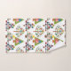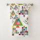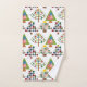 This towel set has a mid-century modern design of Christmas trees in different styles. One has a grid with rectangles with starbursts inside. Another has rounded rectangles with smaller rectangles inside. A third has curved lines with stars on them. The final tree is a triangle with other smaller triangles inside