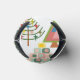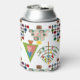 This can cooler has a mid-century modern design of Christmas trees in different styles. One has a grid with rectangles with starbursts inside. Another has rounded rectangles with smaller rectangles inside. A third has curved lines with stars on them. The final tree is a triangle with other smaller triangles inside.