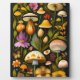 Tabletop art plaque featuring colourful flowers, mushrooms and butterflies that one might find in a lush meadow in the Spring. Botanical digital painting in a modern Haeckel style.
