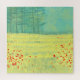 A modern contemporary landscape painting featuring a peaceful flower filled summer meadow with birds flying against the sky and a forest of pine trees in the distance. Fresh and uplifting yellow and green colours. Original art by Nic Squirrell.