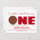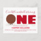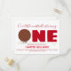 Our little meatball is turning one first baby birthday postcard invitation. This postcard is red, white, and brown with the word "One" in large letters and a cute, smiling, meatball cartoon as the first letter of the word. Customise this postcard invitation, add it to your cart, and happy birthday to your awesome baby!