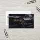 This dark themed mechanic business card features a dark side profile of a shiny black car. Your business name and text/tagline appear within a black text panel strip that runs from the icon from the left towards the right edge of the card. Your contact details appear on the lower left on the back of the card. Designed for car, automotive, transport, mechanic themes.