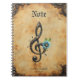 Mechanical clef and flowers to the beat of the clocks. A steampunk-style treble clef, rendered in dark metal with bronze accents and intricate detailing. The clef is adorned with blue flowers that have clock faces at their centres, adding a whimsical touch. Musical notes float near the clef, and small droplets hang from its curves.