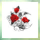 Contour, mechanical crescent moon with gears, decorated with red roses with black spiked stems and leaves on white background. Steampunk
