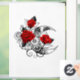 Contour, mechanical crescent moon with gears, decorated with red roses with black spiked stems and leaves on white background. Steampunk