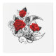 Contour, mechanical crescent moon with gears, decorated with red roses with black spiked stems and leaves on white background. Steampunk