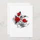 Contour, mechanical crescent moon with gears, decorated with red roses with black spiked stems and leaves on white background. Steampunk
